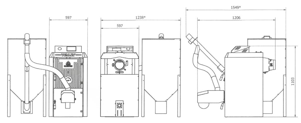 | Dimensiones de la caldera con el depósito colocado junto a la caldera: | |